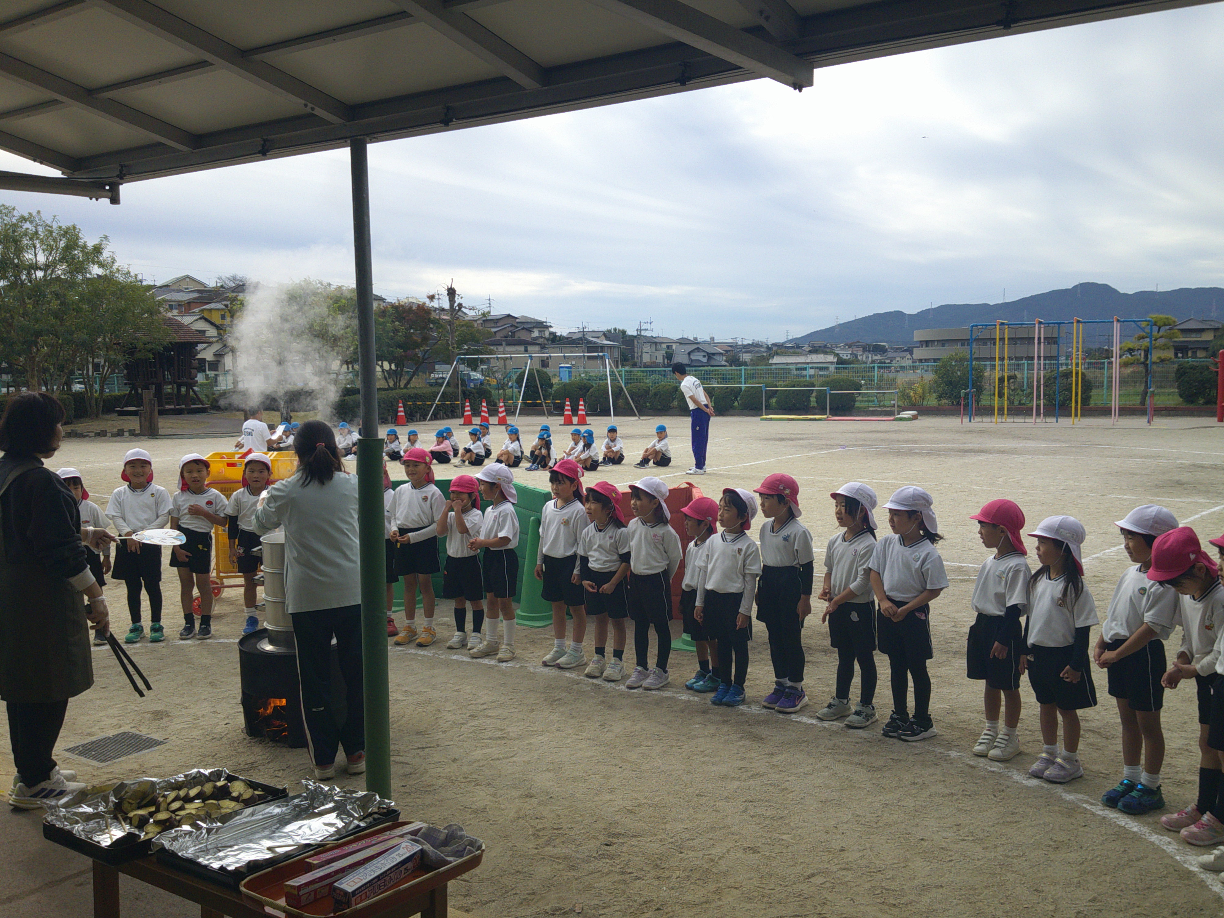 湯気が上がると「真っ白だ!」と話したり、「お腹減ってきたー。」と蒸し芋を食べることにしていました\(^o^)/