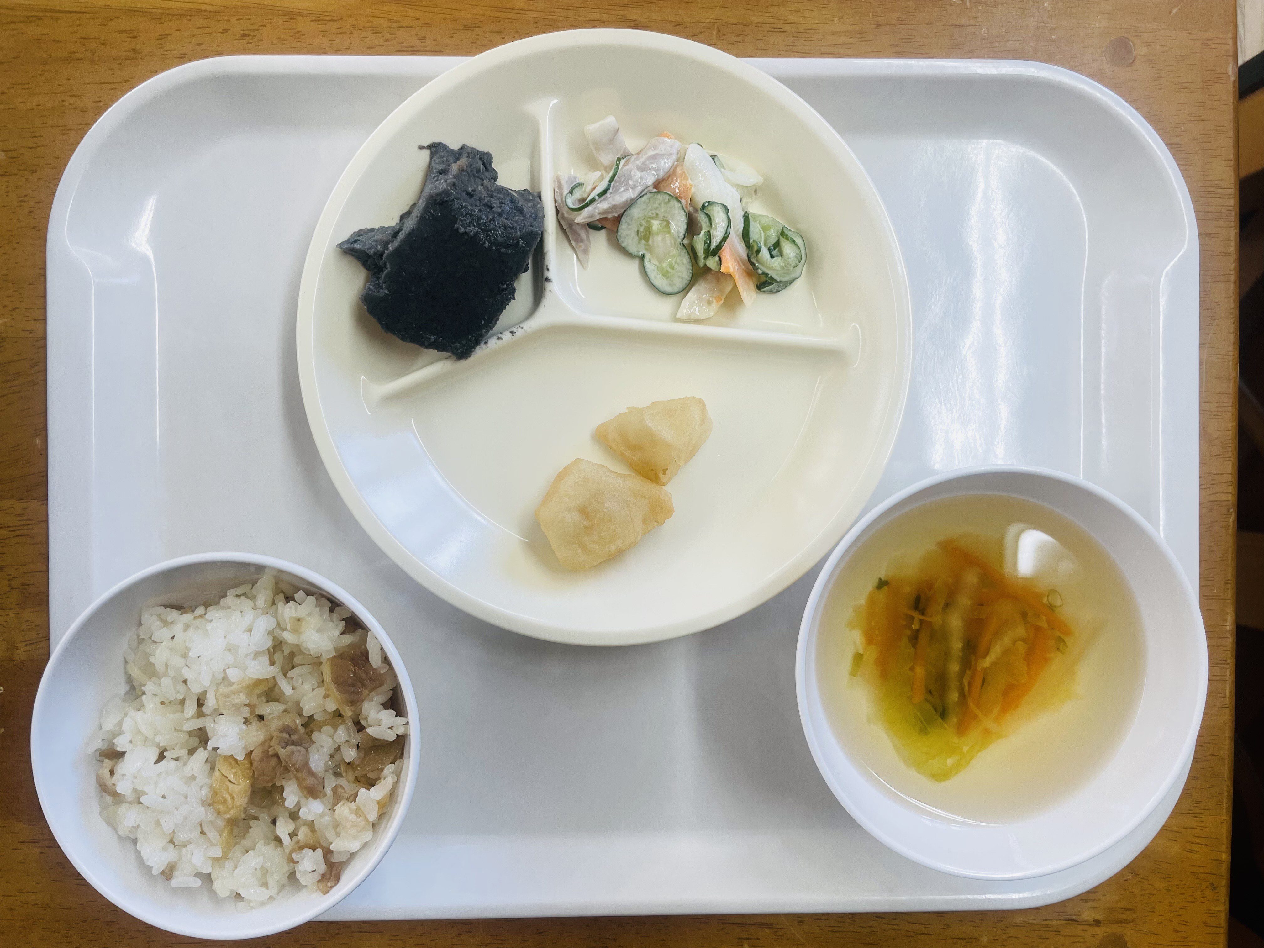 肉ごぼう飯をみると、「いい匂い!美味しそう」「うどん屋さんでみたことある気がする(*^^*)」と興味津々だった子どもたち。おかわりする子がたくさんいて、あっという間に食缶が空っぽになっていたクラスもありました(*^▽^*)