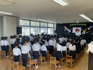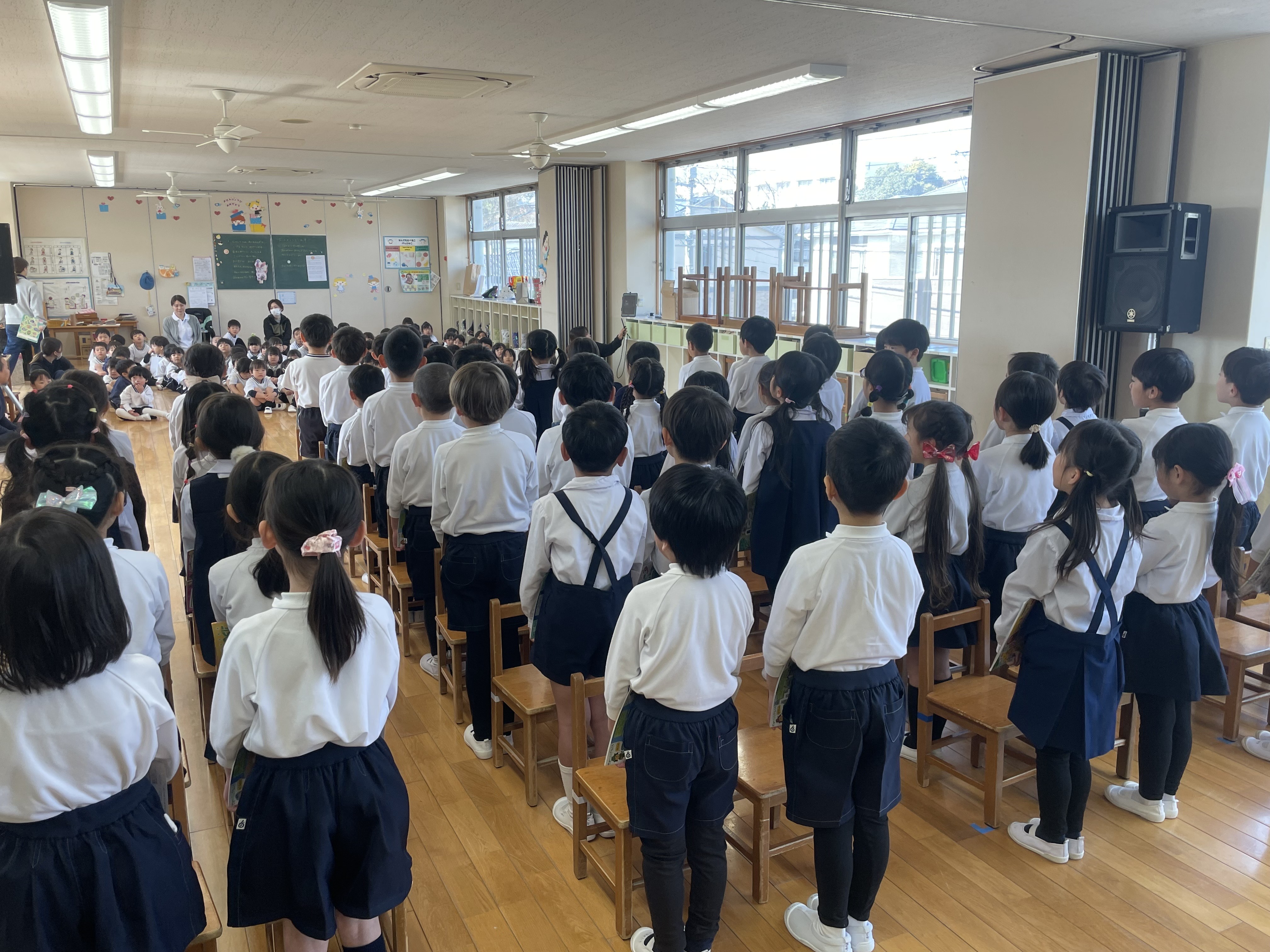そして今日は、明日の卒園式に向けて最後の練習があり、年長さんのかっこいい姿を年少・年中さんも一緒に見ました。