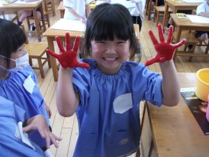 赤・青・緑の絵の具で手を染めて出来たのは、手形!!