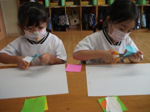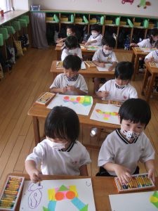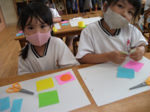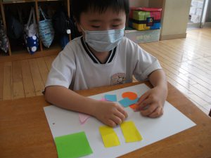 年中さんは 〇・△・▢をいくつか使って それぞれにイメージをふくらませました。