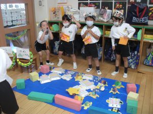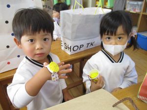 お店屋さんになる人、お買い物に行く人に分かれてお店屋さんごっこが