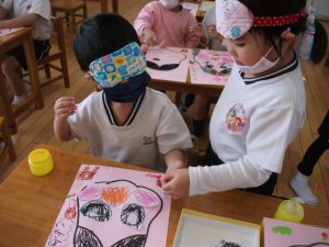 目隠しして顔を作ると ちょっぴり変なお顔になって大笑いの子どもたちでした‼笑
