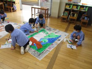 劇で使う絵の色をみんなで力を合わせて絵の具を使って色塗りをしました。