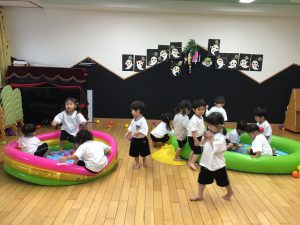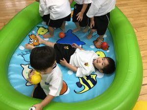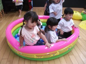 プールには入れませんでしたが、気分だけでも…ということで、入るはずだったプールに、ボールを入れ、“ボールプール”で遊びましたヾ(≧▽≦)ノ