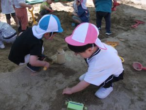 砂場では、大きな山を作ったり、穴を掘ったり、ケーキやごはんを作ったり…砂だらけになりながらも、たくさん遊びました(*^-^*)♫