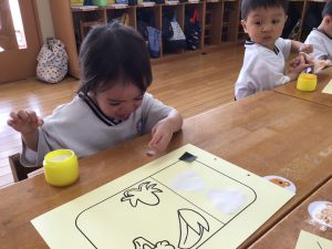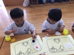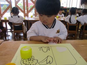 『”1”の指で のりはつけるよ』 『折り紙の白い方に のりをつけようね』など話しながらしました。