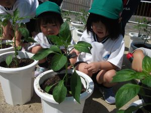 自分の植木鉢に ミニトマトやピーマンを植えました😊