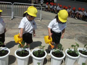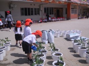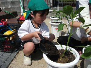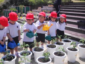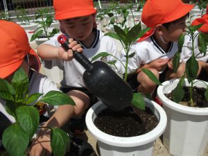 苗を植えて、土を入れて、水やりまで(≧▽≦)