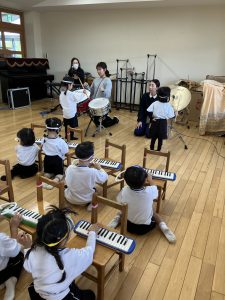 川崎先生と鍵盤ハーモニカを弾いたり、楽器に挑戦してみたり…