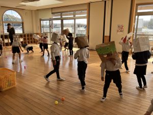 自分たちで作った鬼のお面を付けてクラスごとに鬼退治を頑張りました٩( ”ω” )و